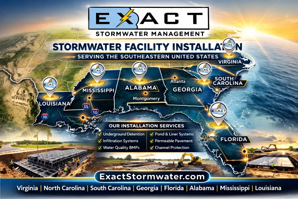 Exact Stormwater provides professional stormwater facility installation for commercial developments, municipal infrastructure, and engineered site projects throughout the Southeastern United States.